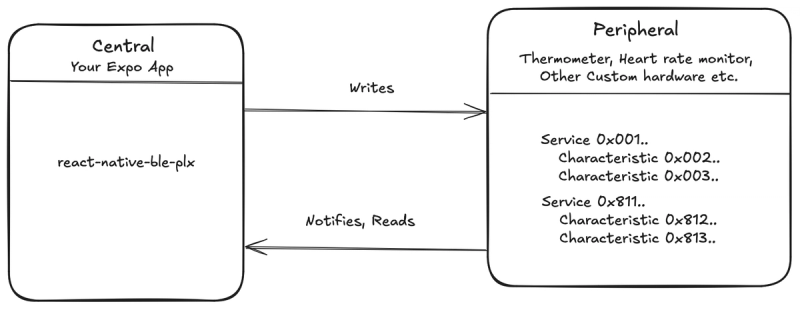 - Central - any device that consumes data from a BLE Peripheral. In our case, this is always going to be your Expo app.
