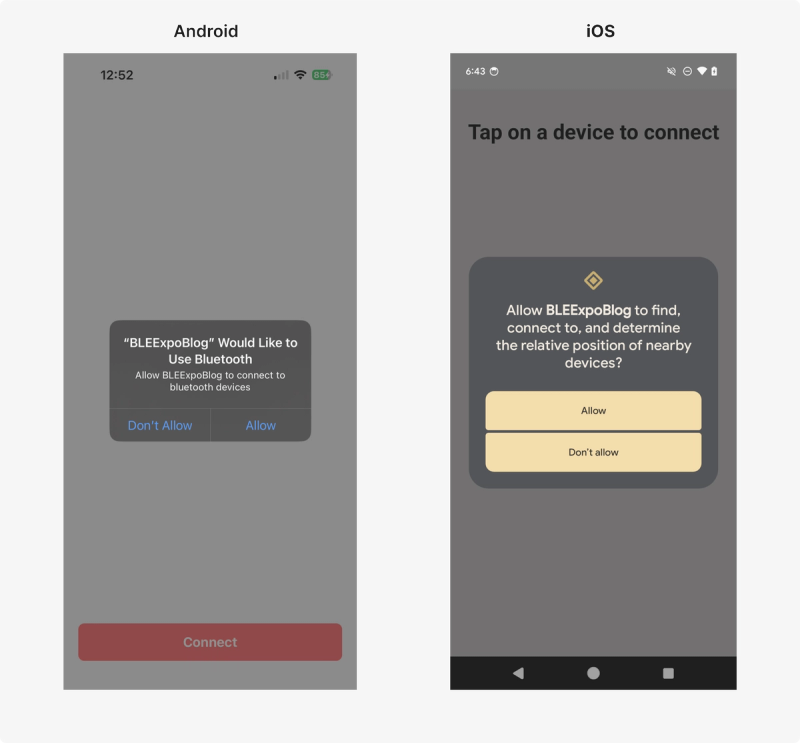 You can then export the requestPermissions function from the hook and uncomment it in the scanForDevices in App.tsx. Next, outside the useBLE hook, create a new global BLE Manager using the code const bleManager = new BleManager();. If you run the app and press connect, you should at this point see the following permission modals.